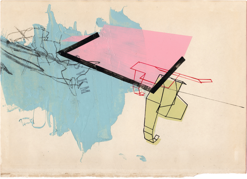India ink, graphite, oil paint and rubber stamp on found paper.